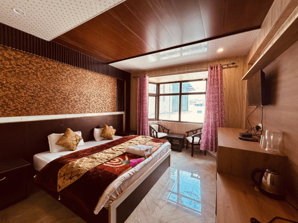 Hotel The Kedar Dev’s offers more premium comfort with spacious rooms, scenic views, and quality food. Ideal for travellers seeking a relaxed experience.